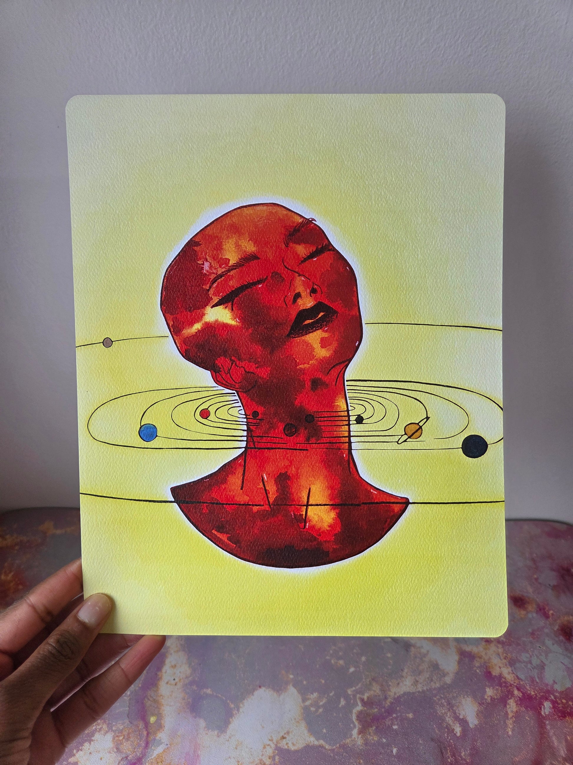 A large art print of the original watercolor painting "The Sun" by Nightowl Doodles that is part of the 11-piece mixed media painting series "The Solar System." The art print is 8x10 inches in size and is printed on textured paper to replicate the feeling of an original watercolor painting.